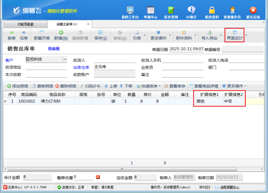 新開單據時,在界面設計勾選顯示單據明細擴展信息。選擇商品名稱,對應擴展信息自動提取到單據。例如商品“得力訂書針”,其擴展信息1和2能快速顯示在單據上。