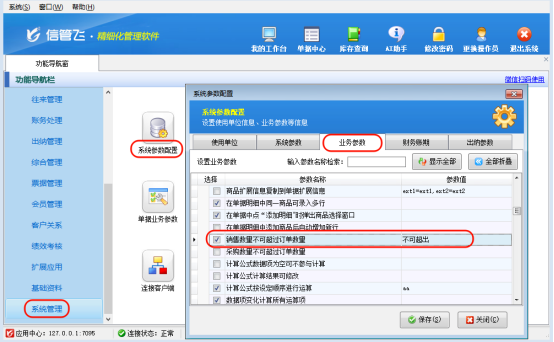 三步輕松配置,操作簡單易懂 1.登錄系統(tǒng)后,進入系統(tǒng)管理模塊,依次點擊 “系統(tǒng)參數(shù)配置”—“業(yè)務(wù)參數(shù)”,在參數(shù)列表中找到 “銷售數(shù)量不可超過訂單數(shù)量” 選項;