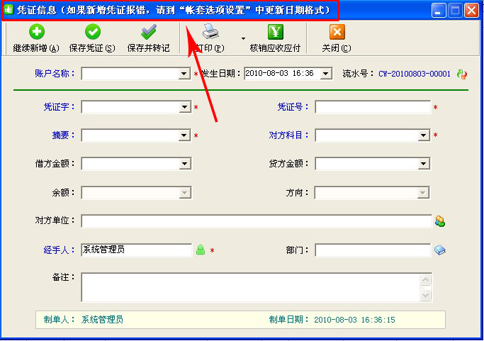 首次下載安裝好好用財務(wù)出納記賬系統(tǒng),在“現(xiàn)金日記賬”或“銀行日記賬”功能中,點擊“新增憑證”進行憑證錄入時,如果出現(xiàn)下圖所示錯誤: 出現(xiàn)這種情況,可能是您電腦格式的問題。修復(fù)這個問題,我們使用本系統(tǒng)的“調(diào)整日期顯示格式”功能即可。 下面是“調(diào)整日期顯示格式”功能的操作步驟: &n