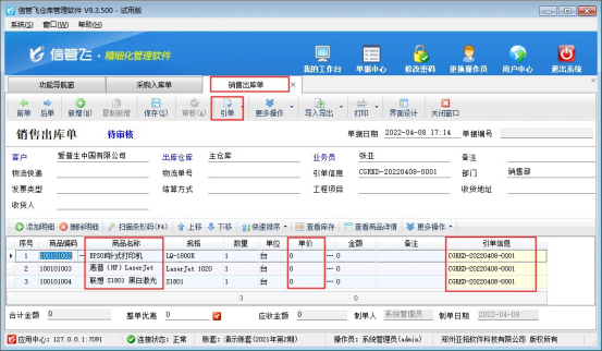 信管飛倉庫管理軟件、信管飛RMS軟件等都支持開采購入庫單和銷售出庫單,對于采購和銷售同一商品的用戶,軟件支持銷售出庫單直接引單采購入庫單,默認引單會取采購入庫單的所有信息,如果銷售價格和采購價格不一樣,軟件支持銷售出庫單引用采購入庫單不引用價格信息,本文以“信管飛倉庫管理軟件”為例示范下如何操作?     在