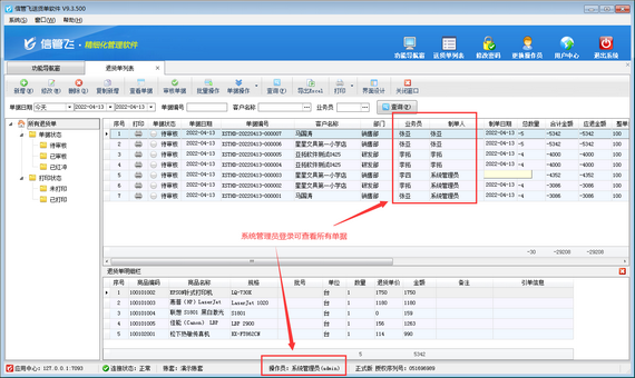 信管飛倉庫管理軟件、信管飛送貨單軟件、信管飛RMS軟件,都支持設(shè)置多個操作員并對操作員進行權(quán)限控制,通過設(shè)置操作員的“數(shù)據(jù)權(quán)限”,可以更精細的控制操作員對業(yè)務(wù)單據(jù)的查看權(quán)限。有用戶需要操作員只能查看本部門人員單據(jù),以“信管飛倉庫管理軟件”為例,示范下如何操作?     示例:操作員“系統(tǒng)管理員”和操作員“張亞
