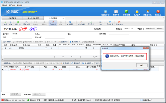 • 反審修改生產任務單時提示“當前任務單已下達生產領料…