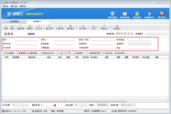信管飛系列軟件都支持自定義設計打印模板,軟件中已內置多種打印模板樣式,默認內置打印模板樣式字體樣式是固定的,比如使用單位字體是黑體顯示,其他內容字體是宋體顯示,如下圖所示: 需要修改使用單位名稱為“楷體”顯示,該如何設置?以“送貨單軟件”為例,送貨單開單界面打印下選擇“打印格式設計”,在打印格式設計界