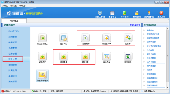 此文章相關演示視頻:專業版軟件如何顯示財務處理輔助單據演示視頻     信管飛RMS專業版軟件支持使用財務處理功能,部分用戶在使用最新版本軟件時,會發現財務處理功能沒有一般費用單、其他收入單、調賬業務等功能,這是因為未勾選“顯示財務處理輔助單據”參數導致的,本文以“RMS專業版”為例介紹下如何顯示財務處理輔助