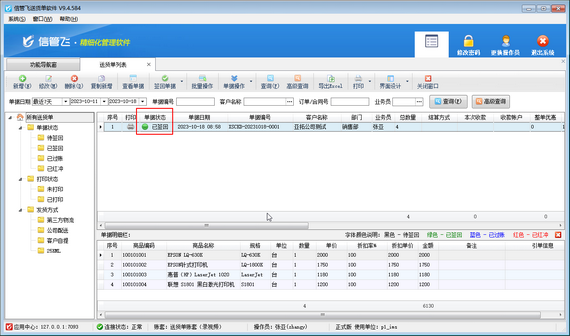 演示視頻觀看鏈接:操作員沒有簽回單據(jù)的權限,如何解決演示視頻 送貨單一般情況下是一式三聯(lián)(存根聯(lián)、客戶聯(lián)、回單聯(lián)),其中回單聯(lián)的作用是:在購買方收到商品核對完畢,與送貨單上的商品明細相符后,在回單聯(lián)上簽完名,由銷售方拿回,證明貨物已送達,買方確認已簽收。 信管飛送貨單軟件通過狀態(tài)控制實現(xiàn)簡