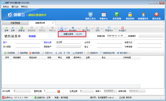 信管飛RMS軟件支持新開銷售退貨單引用銷售訂單,但是部分用戶在使用信管飛RMS軟件的過程中銷售退貨單引用銷售出庫單,本文具體介紹下信管飛RMS軟件退貨單中如何引用銷售出庫單?     此文章相關演示視頻:退貨單如何引用銷售出庫單演示視頻     在功能導航窗點擊“系統管