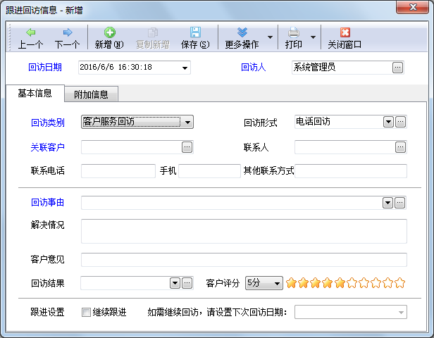 跟蹤回訪用于管理對銷售機會、合同、客戶服務單等進行跟蹤回訪,回訪包括電話回訪、郵件回訪、短信回訪、上門回訪、QQ/微博/微信回訪等各種形式。支持對未解決的回訪進行再次跟蹤回訪。亞拓管理軟件支持在相應功能中發起回訪錄入回訪記錄,也可以在跟蹤回訪管理中錄入回訪記錄。    跟蹤回訪管理為客戶關系管理模塊(擴展模塊),只有在亞拓管理軟件標