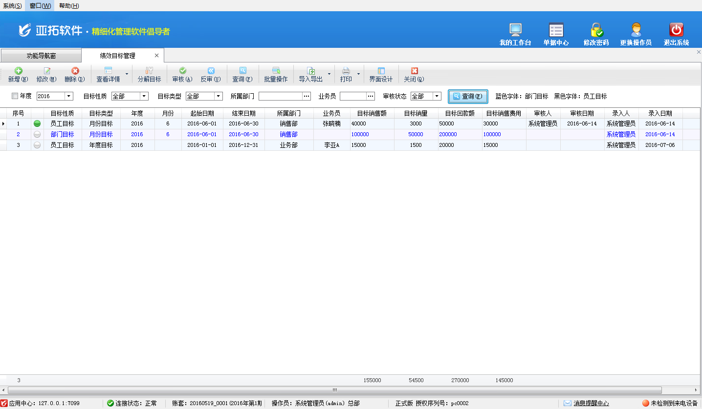 績效目標管理模塊屬于擴展模塊,只有在亞拓管理軟件標準版和專業版中才能使用,績效管理通過設定科學合理的組織目標、部門目標和個人目標,為企業員工指明了努力方向,促進組織和個人績效的提升。    在功能導航窗點擊“擴展應用”——“績效目標管理”,即可進入“績效目標管理”界面,其界面如下圖所示。    新增績