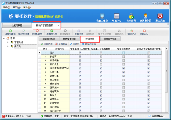亞拓管理軟件、紅管家出納記賬軟件、紅管家倉庫管理軟件等都可以設置操作員的查看修改業務單據權限。通過設置操作員的“數據權限”,更清晰方便的管理分配的操作員單據權限。通過“系統管理”---》操作員及授權進入操作員管理及授權界面,在權限模塊可看到“數據權限”,在此設置操作員的“可修改有查看權限的數據”的權限,如圖1所示: 圖1  &nb