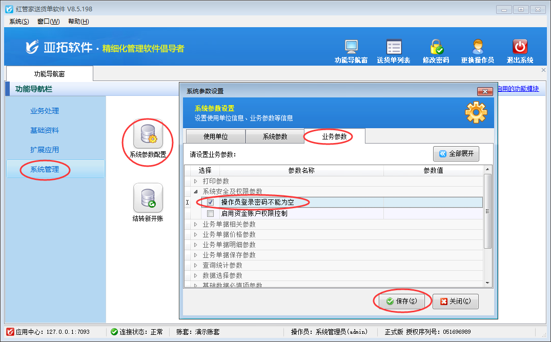亞拓管理軟件、紅管家送貨單軟件、紅管家倉庫管理軟件、紅管家出納記賬軟件等軟件內(nèi)都可以設(shè)置多個操作員,并可以設(shè)置操作員登陸密碼不能為空,本篇文章我們以紅管家送貨單軟件為例詳細介紹一下如何設(shè)置操作員登陸密碼不能為空? 在功能導(dǎo)航窗點擊“系統(tǒng)管理”→“系統(tǒng)參數(shù)設(shè)置”→“業(yè)務(wù)參數(shù)”可以打開“業(yè)務(wù)參數(shù)”配置界面,在系統(tǒng)安全及權(quán)限參數(shù)內(nèi)
