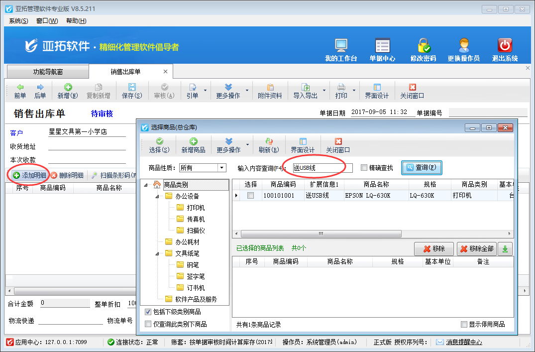 亞拓管理軟件、紅管家倉庫管理軟件和紅管家送貨單軟件開單時都支持選擇系統內已錄入的商品信息,進行快速選擇商品來開單。開單時,選擇商品窗口,可以根據商品編碼、商品名稱、規格、條形碼等信息查詢商品,如果“商品擴展信息”錄入了數據,我們也可以根據“商品擴展信息”進行查詢。下面我們以亞拓管理軟件專業版為例介紹一下銷售出庫單開單選擇商品時,根據“商品擴展信息”查詢商品的操