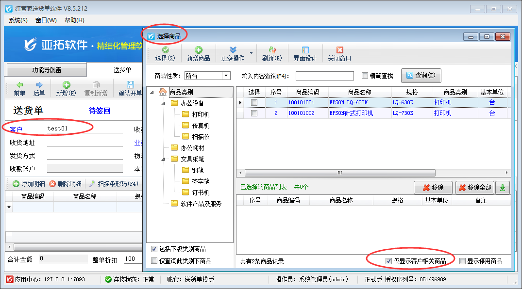 亞拓管理軟件、紅管家倉庫管理軟件和紅管家送貨單軟件開單時都支持選擇系統內已錄入的商品信息,進行快速選擇商品來開單。選擇商品時在選擇商品窗口默認是可以顯示所有商品(圖一),但是部分用戶在選擇商品時只需要顯示此客戶相關的商品,如何設置呢?本篇文章我們以紅管家送貨單軟件為例來詳細介紹一下如何設置在選擇商品窗口僅顯示客戶相關商品?圖一 新開送貨單
