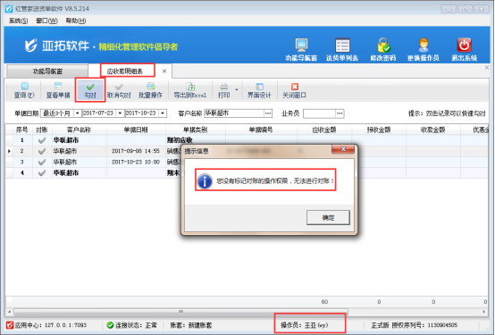 亞拓管理軟件、紅管家送貨單軟件支持管理應收賬,對于已結銷的應收款,可以在應收款明細表中標記對賬。軟件支持設置操作員是否具有對賬權限,以送貨單軟件為例,示范下如何控制操作員的應收款對賬權限。 在功能導航窗,點擊“操作員管理及授權”,進入操作員管理及授權頁面,選擇需要設置的操作員“王亞”(系統(tǒng)管理員默認具