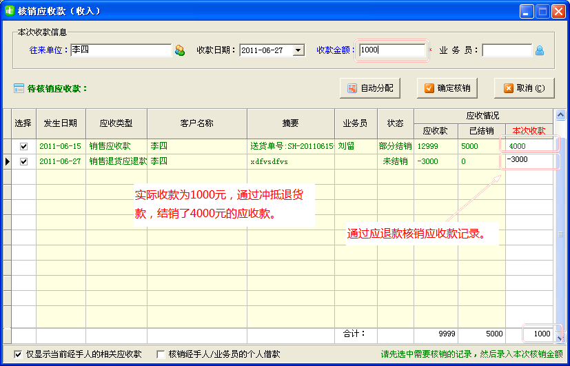 我公司的出納記賬軟件、進銷存軟件、送貨單軟件等都有應收款應付款往來帳管理功能,支持增加預付款、應退款,并可以將周期性的應收應付款進行批量增加(比如房租、車貸、固定收益等),在核銷往來帳時,預付款、應退款可以沖抵應收應付。核銷記錄可以轉記日記賬憑證。   有客戶在核銷往來帳時,有時會出現誤核銷的情況,這個時候想刪除核銷記錄,或者想刪除往來帳(應收款/應付