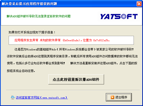 部分用戶機器在登錄出納記賬系統或商業進銷存系統時,啟動界面過后,直接報錯并退出系統。系統提示錯誤信息如下:     出現這個錯誤提示,是由于Windows的基礎組件ADO數據庫訪問引擎被某家公司的軟件破壞導致。安裝該軟件后,會自動劫持ADO注冊到其程序所在目錄,卸載該軟件后后所有使用ADO數據庫訪問引擎的軟件都將無法使用,包括眾多知