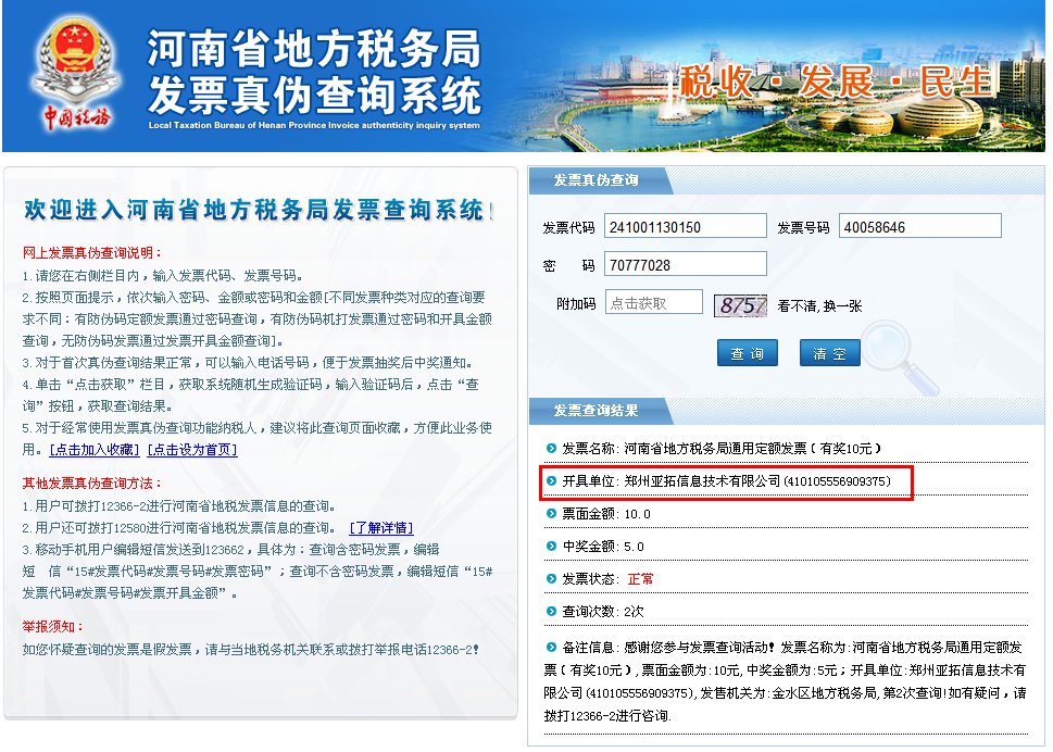 我公司已支持開具機打發票,詳細請見: 有關開具發票及真偽查詢等事項的說明【2013版】  亞拓軟件(全稱:鄭州亞拓信息技術有限公司)是注冊于河南省鄭州市金水區的一家軟件技術服務公司,核定經營范圍為:計算機軟件開發與技術咨詢服務,注冊資金50萬元,旗下擁有“亞拓”、“紅管家”、“好好用”、“銷售寶”等多個產品品牌,開發進銷存管理軟件、出納記賬管理軟件、售