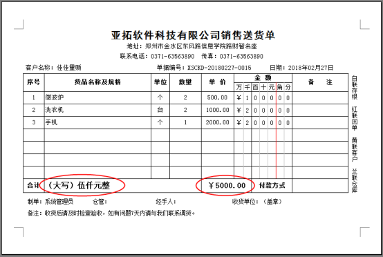 亞拓管理軟件、信管飛送貨單軟件、信管飛倉庫管理軟件等支持打印單據內容,支持自定義設計打印模板,有時候模板字體需要加粗加大顯示,可以設置打印模板中的字體格式。我們以送貨單軟件為例,介紹下如何設置打印模板中字體加粗加大顯示。    先新增一個送貨單,正常開單后確認開單,預覽之前的模板,合計金額的字體是未加粗樣式,如下圖1所示:&nbs